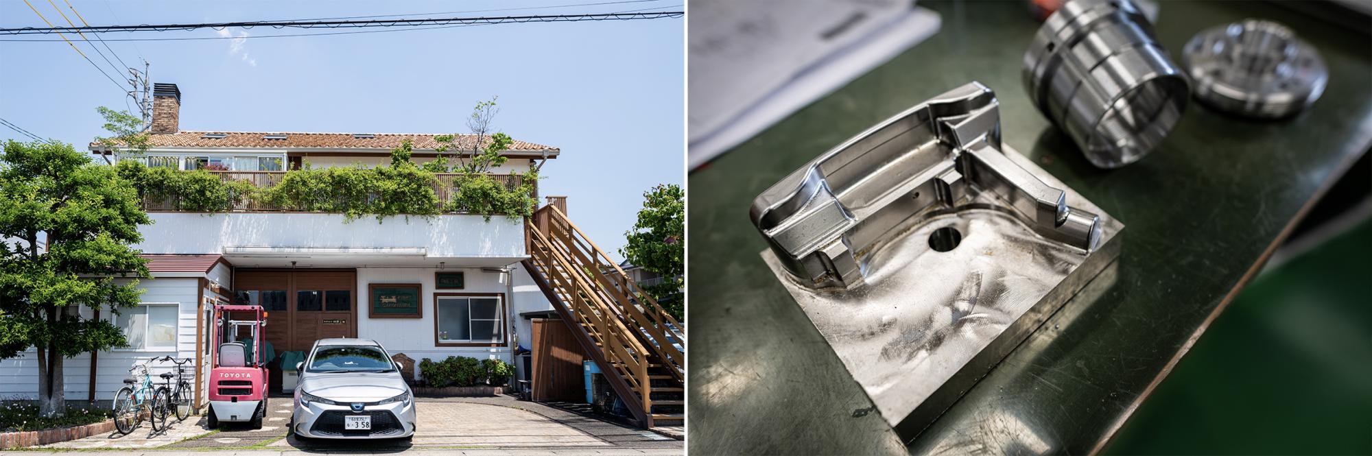左:会社外観から個性が光る / 右:金属削り出しの加工物