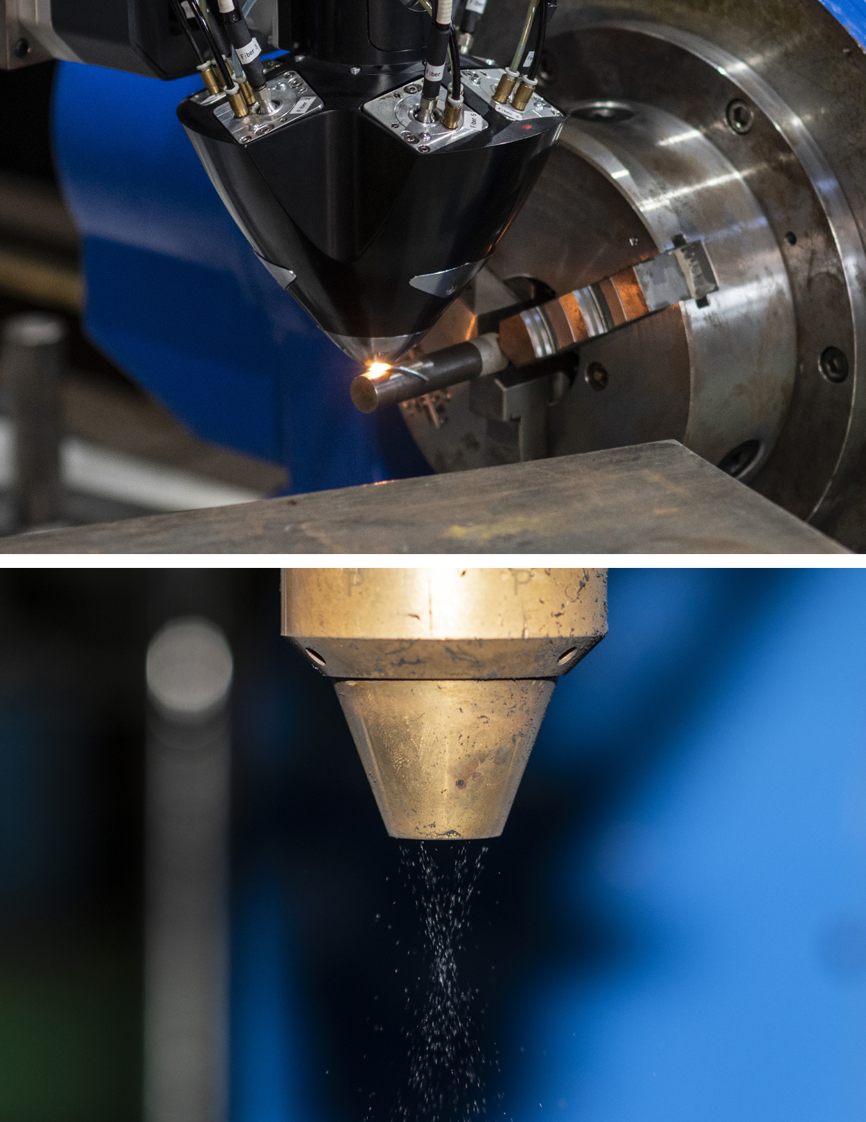 写真下:金属の粉体で肉盛り加工をするレーザクラッディング