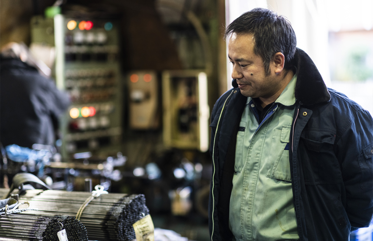 写真中:全国シェア9割にも上る草刈り機のシャフト。