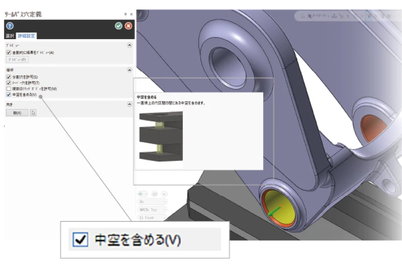穴加工ツールパス作成時に、穴区間の中空部分の選択を制御できる中空を含めるチェックボックスが追加されました。