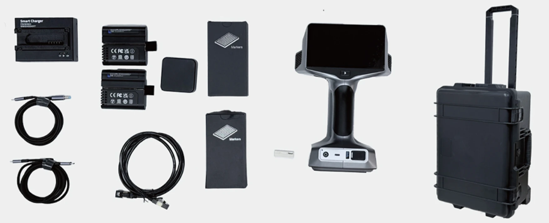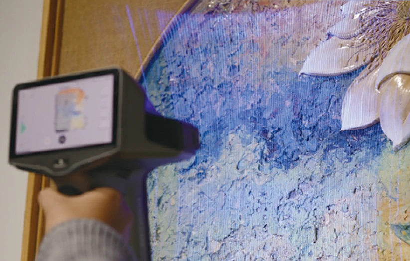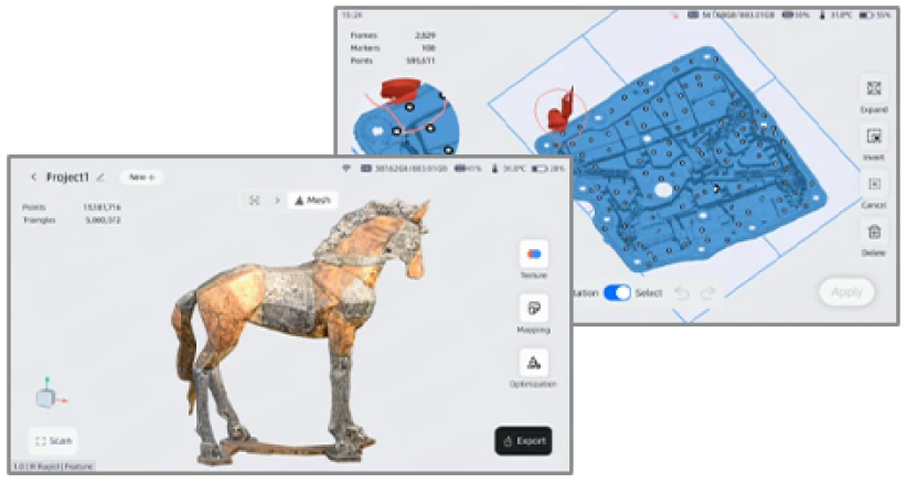 再設計された赤外線レーザとブルーレーザ、さらにVCSELによる赤外線レーザパターンの3つの光源を切り替え、スキャンする対象物に応じて最適なモードで使用することができます。対象物は手のひらに乗る模型サイズから建築用途の数mの大きさ、さらに屋外でもスキャン可能。ケーブルとPCが不要になり行動の制限なく一人でオペレーションが可能です。さらに4800万画素のカラーテクスチャカメラを搭載したことで、従来は不可能だったブルーレーザモードによる高解像度のスキャンにて、カラーテクスチャ取得ができるようになり、光沢や黒を含んだ文化財などのデジタルアーカイブ用途としても強力なパワーを発揮します。医療、工業から建築、そしてアートの分野や法医学まで、これ1台で多彩な領域をカバーします。
