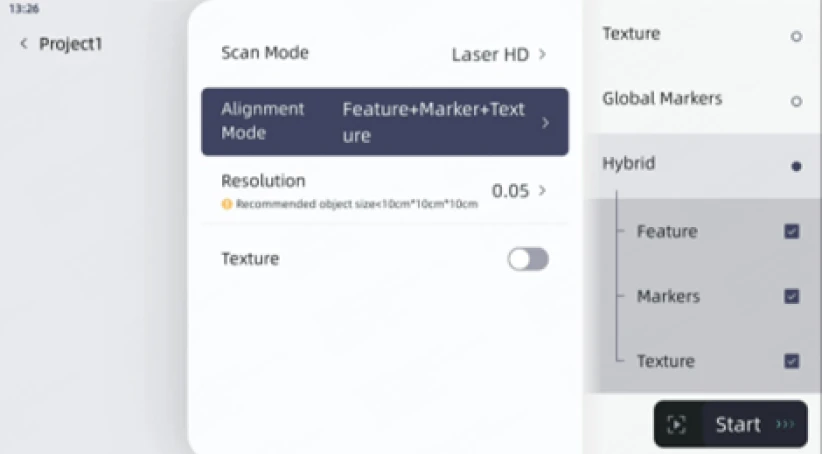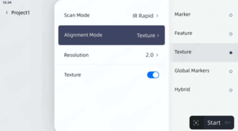 特徴、マーカー、テクスチャの位置合わせモードを自由に組み合わせるハイブリッド機能で、多様なスキャンニーズに対応するソリューションを構築できます。テクスチャ画像のキャプチャを行わずにテクスチャの位置合わせを行うことで、ストレージ容量を節約し、データ処理を高速化できます。